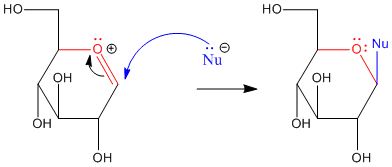 Figure CO18.2. Addition of a nucleophile at the anomeric center of glucose.