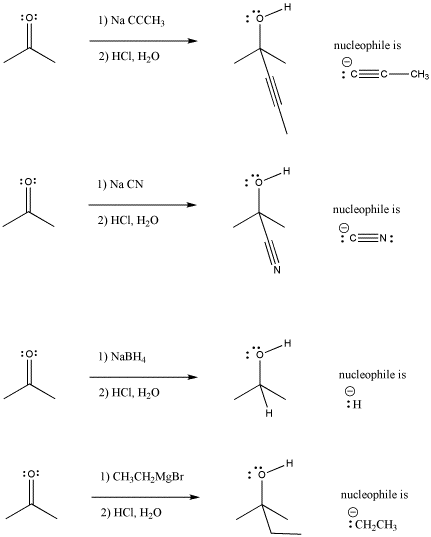 In the following pictures, a number of anions are added to a simple carbonyl compound, a ketone (2-propanone, or acetone). In each case, addition of the nucleophile is followed by addition of a proton source. Note that, overall, the reaction involves addition of the nucleophile to the carbonyl carbon and addition of the proton to the carbonyl oxygen.