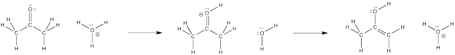 Under those conditions, what will the first step look like? Maybe a proton is transferred from the hydronium ion to the oxygen atom on the ketone. That would get us halfway there. Remember, the keto-enol tautomerism involves addition of a proton to that oxygen.