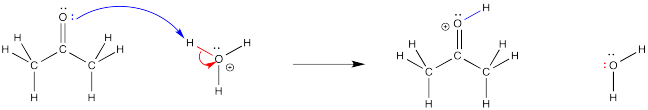 Notice that, in the elementary step shown above, a bond forms between the carbonyl oxygen and one of the protons on the hydronium ion (H3O+). A covalent bond is a pair of electrons shared by two atoms. Where do the electrons come from to form that bond? They used to be a lone pair on the carboyl oxygen. A curved arrow is used to show that.