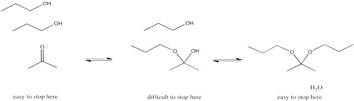 With alcohols, two oxygen groups replace the carbonyl oxygen.