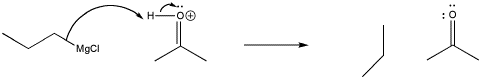 Remember, the order of these two steps is very important. Adding the acid before the Grignard reagent would not work, because the Grignard reagent would become protonated at the carbon. Although the Mg-C bond is covalent, it is still polar enough so that the carbon can act as a nucleophile or as a base. Once propylmagnesium has become protonated, it forms propane, which isn't likely to act as a nucleophile.
