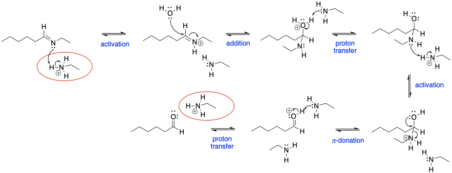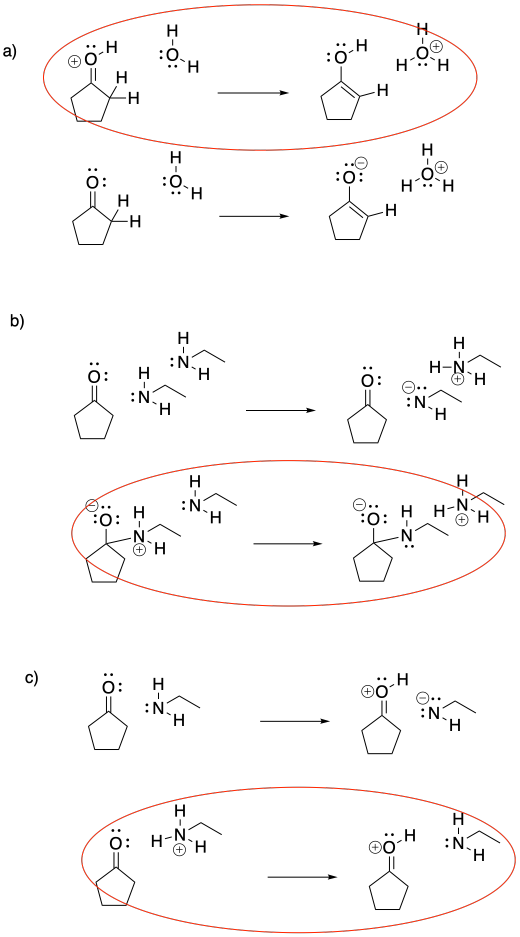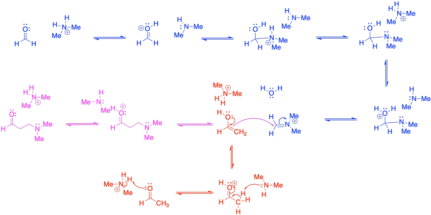 This mechanism requires formation of both an iminium ion (blue) and an enol