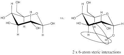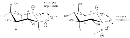 a) The lone pairs are farther from each other in the alpha anomer than in the beta anomer. That leads to weaker repulsion in the alpha anomer than in the beta anomer, based on Coulomb's Law. Coulomb's Law indicates the energy increase due to repulsion is inversely proportional to distance.
