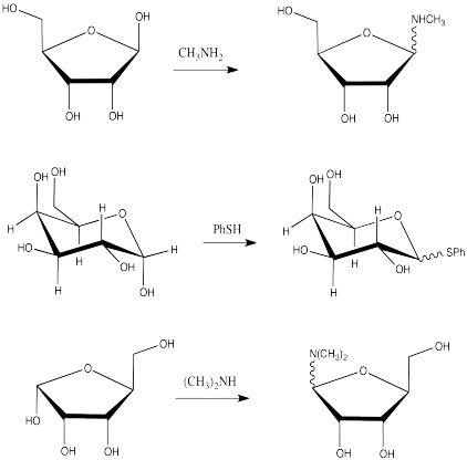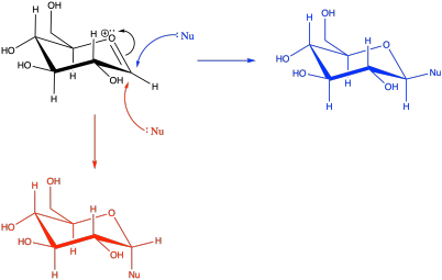 If the OH group on the anomeric position becomes protonated, it is easily pushed out by the oxygen in the ring. A nucleophile would then be attracted to the anomeric carbon.