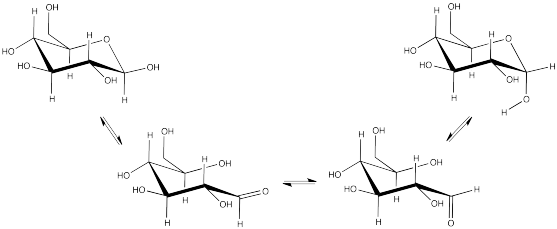 b) We do know that, over time, an equilibrium is reached between these two isomers via mutarotation. That means that eventually, the solution would reach a value of 48 degrees, which is based on the contributions of differing amounts of the two diastereomers to the optical rotation.