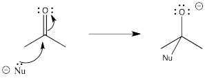 A lone pair is donated from a nucleophile to the carbonyl carbon, forming a bond.