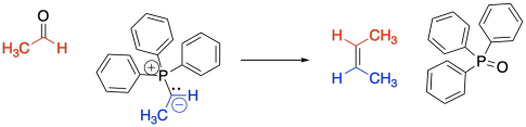 The classic example of an ylide addition to a carbonyl is the Wittig reaction. The Wittig reaction involves the addition of a phosphorus ylide to an aldehyde or ketone. Rather than producing an alcohol, the reaction produces and alkene. The reaction is driven by formation of a phosphorus oxide "side product".