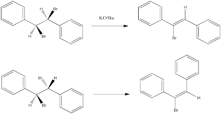The following reactions of potassium tert-butoxide with dibromostilbene (1,2-dibromo-1,2-diphenylethane) both occurred via an E2 mechanism. Two different diastereomers were used. Two different stereoisomers (E vs. Z) resulted.
