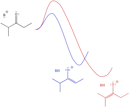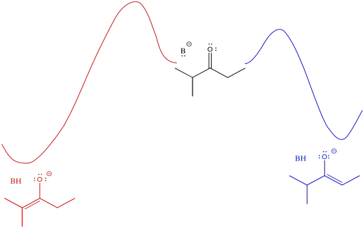On the other hand, if you intend to take the proton off the least substituted position, you don't want any reversibility. Given the chance, the wrong enolate will eventually form. You want to just take what you get the first time, which is more likely to be the blue pathway because of its lower barrier. Earlier, we used a bulky amide base to form the least stable enolate because we didn't want to allow the possibility of second chances.