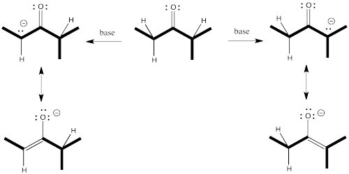 One of the complications that can arise with these nucleophiles has to do with asymmetry about the carbonyl (or the would-be carbonyl). If one alpha position next to the carbonyl isn't the same as the other one, two possible enolates could result from removal of a proton.