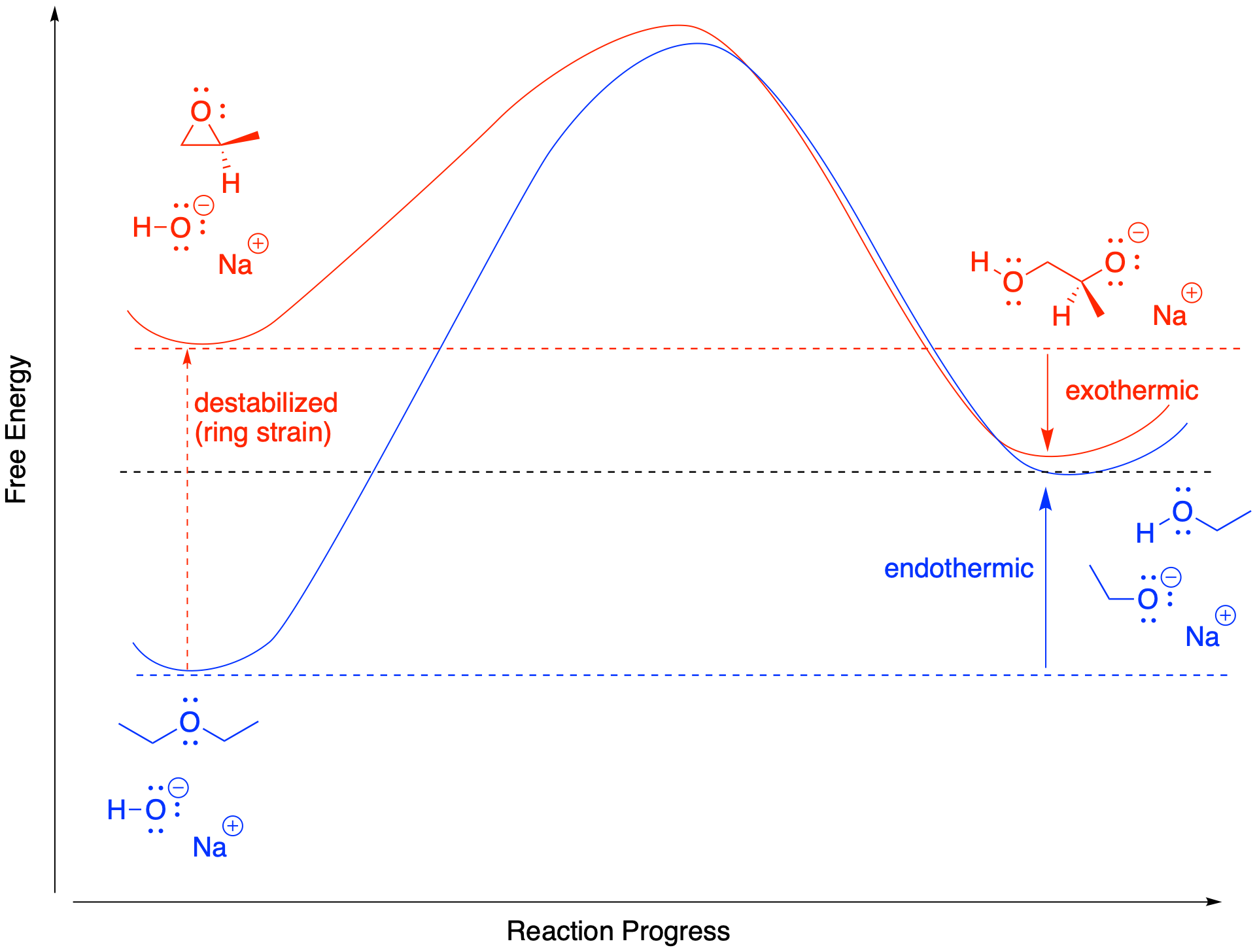 Figure NS11.3. Reaction progress diagram comparing ether cleavage in base to epoxide ring-opening in base.