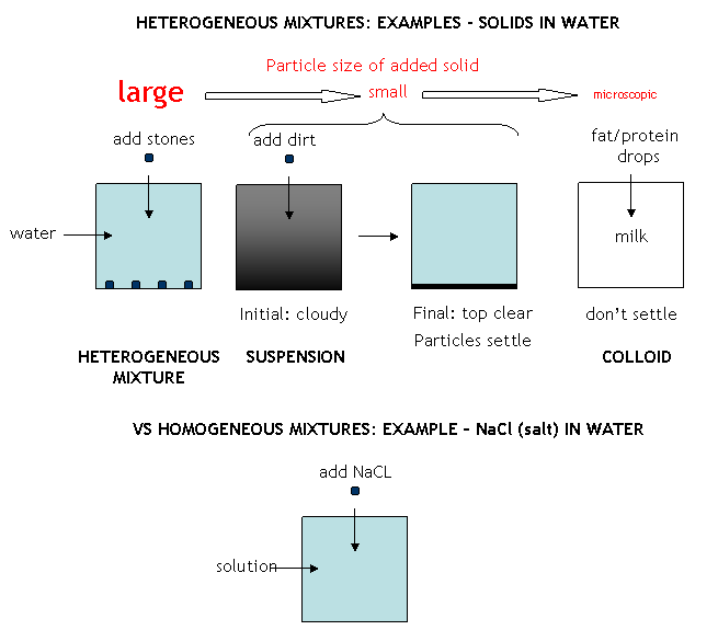 We discussed that matter usually never exists in a pure state in nature. Rather, pure substances are combined to form mixtures. Mixtures can be separated into heterogeneous and homogeneous mixtures. Consider mixtures composed of a solid added to a liquid like water. In a heterogeneous mixtures, the solid particles can be readily discerned in the liquid, such as the case of sand or rocks (particles of relatively large size) in water. The solids in this case can be separated from water filtration. In some cases, the solid particles are of intermediate size, and soon settle out after addition to water. Such a heterogeneous mixture (for example, dirt in water)is called a suspension. The dirt particles can be separated from the water by filtration. If the particles are microscopic and can't be seen with the naked eye (such as in milk or blood), the particles stay suspended and don't settle out. This kind of mixture is called a colloid. The microscopic particles in a colloid can be separated from water by high speed centrifugation or with some specially designed filters. An unsettle suspension and colloids are cloudy, and light passing through the mixture scatters from the particles.. In homogenous mixtures, the particles are so small that they never separate on standing or in simple centrifugation, and do not interfere with light passing through the mixture. Hence the mixture appears clear. Homogeneous mixtures are also called solutions. Mixtures can be separated into component parts by purely physical process, including evaporation, condensation, filtration, sublimation, deposition, etc. The components of the mixture must have different physical properties which allow the components to be separated from each other.