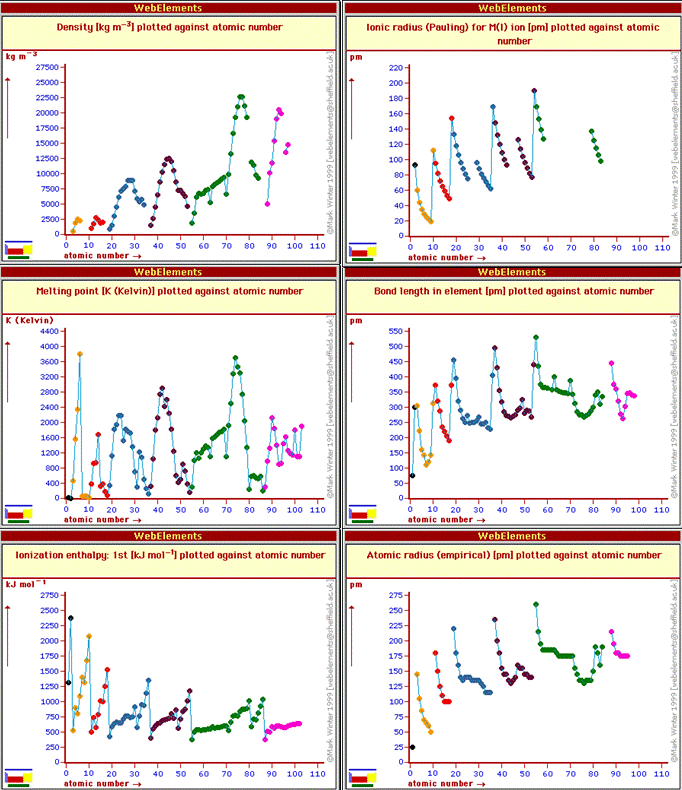 The periodic table is really a graphical representation of periodic law: that the chemical and physical properties of elements are periodic functions of the atomic number. We will (have) discuss(ed) in class how the ionization energy increases across period 1 (from H to He), and then drops precipitously for Li in the start of period 2, followed by a general increase across period 2 (from Li to Ne) before another precipitous drop for Na, the start of period 3 elements. The drop at the start of each period arises because it is easier to remove an electron from an atoms the farther away the electron is from the nucleus. At the start of each period the added electron is in a new shell further from the nucleus than the inner shells. Other periodic trends are shown in the figure below which was made from the Web Elements periodic table web site.