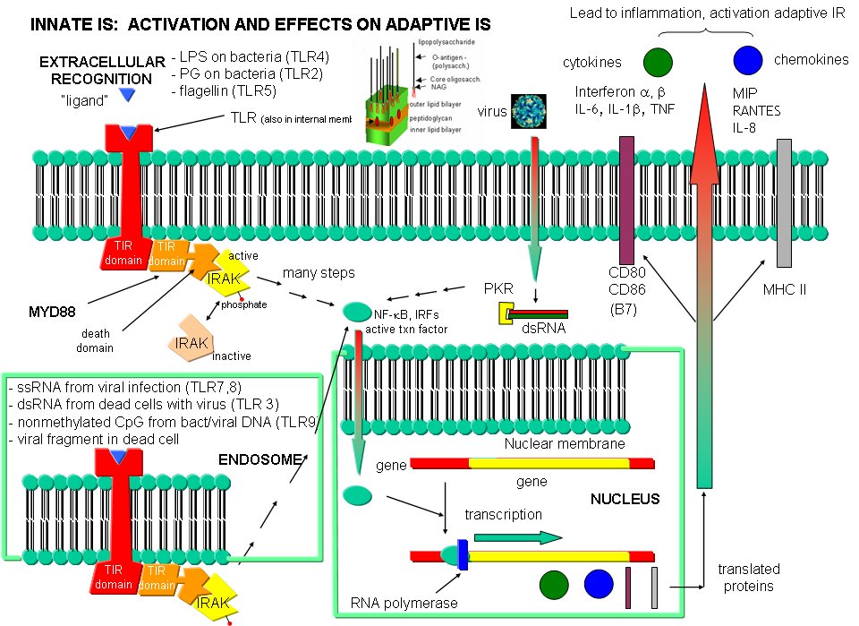 The adaptive immune response must be activated by cells on the innate immune system. These cells must recognized viruses and living cells like bacteria, fungi, and protozoans like amoebas. There are often common structural features in these different classes of cells. The cells of the innate system (dendritic cells, macrophages, eosinophils, etc) have receptors (Toll-like Receptors 1-10 or TLRs) that recognize the common pathogen associated molecular patterns (PAMPs) , which leads to binding, engulfment, signal transduction, maturation (differentiation), antigen presentation, and cytokine/chemokine release from these cells. Take for example dendritic cells, which reside in the peripheral tissues and act as sentinels. They can bind PAMPs which include:
