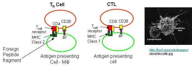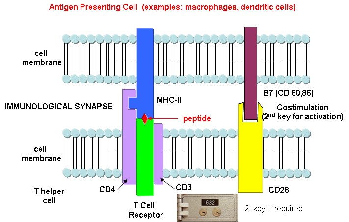 B cells and T cells must be "turned on" before the can do their thing. It is important to regulate the on switch. If the cells were to be become active without need, the cells might turn against self, which would be a big problem. It turns out that it is not enough for the T cell to bind foreign peptide:MHC complexes to get activated. They must bind another protein on the antigen-presenting cell. In the case of T helper cells. a protein on the T cell, CD28, must also bind a protein, B7, on the antigen-presenting macrophage, Hence there is one specific signal (the peptide:MHC complex binding to the T cell receptor) and a nonspecific signal (B7 binding CD28). Why are two signals needed for activation? Again Sompayrac has a great analog - that of a safety deposit box. It takes two keys (a specific key which you own and a nonspecific key (which the bank opens and which opens all the boxes) to open the box. Think of it as double security. You don't want to activate immune cells for killing unless you really need to do so.