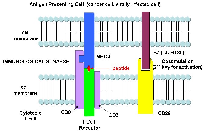 Cytotoxic T cells have another protein CD8, which binds to its T cell receptor. The CTL must also have a second nonspecific signaling protein (as mentioned above in the safety deposit box analogy) for cell activation.