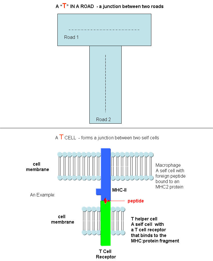 T cells also recognize antigens but unlike B cells, these antigens can only be proteins fragments. The membrane proteins that recognize proteins fragments are call T cell receptors. In addition, they don't recognize protein antigens in isolation. They must be bound to a protein on the surface of an "antigen" presenting cell (such as a macrophage or dendritic cell). The T cell receptor recognizes and binds simultaneously to the foreign protein fragment and to the to the self protein on the surface of the antigen-presenting cells. The self protein which binds and presents the foreign protein fragments (peptides) is called a MHC protein (Major Histocompatability Complex).