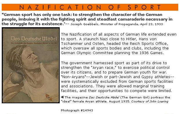 The Olympics were a perfect arena for the Nazi propaganda machine, which was unsurpassed at staging elaborate public spectacles and rallies. Choreographed pageantry, record-breaking athletic feats, and warm German hospitality made the 1936 Olympic Games memorable for athletes and spectators. Behind the facade, however, a ruthless dictatorship persecuted its enemies and rearmed for war to acquire new "living space" for the "Aryan master race." |